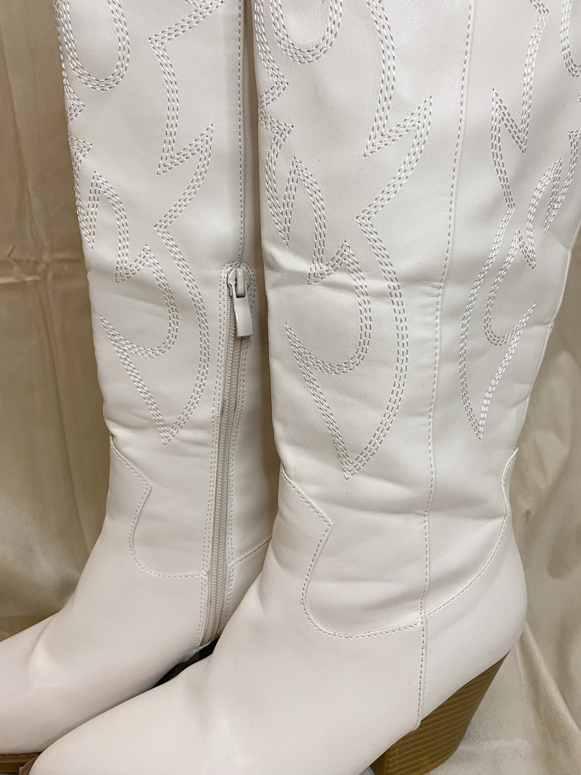 Knee high white western boots are a stylish and trendy footwear choice that feature a classic Western design. These boots are made with white leather and have pointed toes, stacked heels, and intricate embroidery. They are perfect for adding a bold and fashion-forward statement to any outfit, while also providing comfort and support for all-day wear. Whether you're looking to dress up or down, knee high white western boots are a versatile and chic addition to any wardrobe.