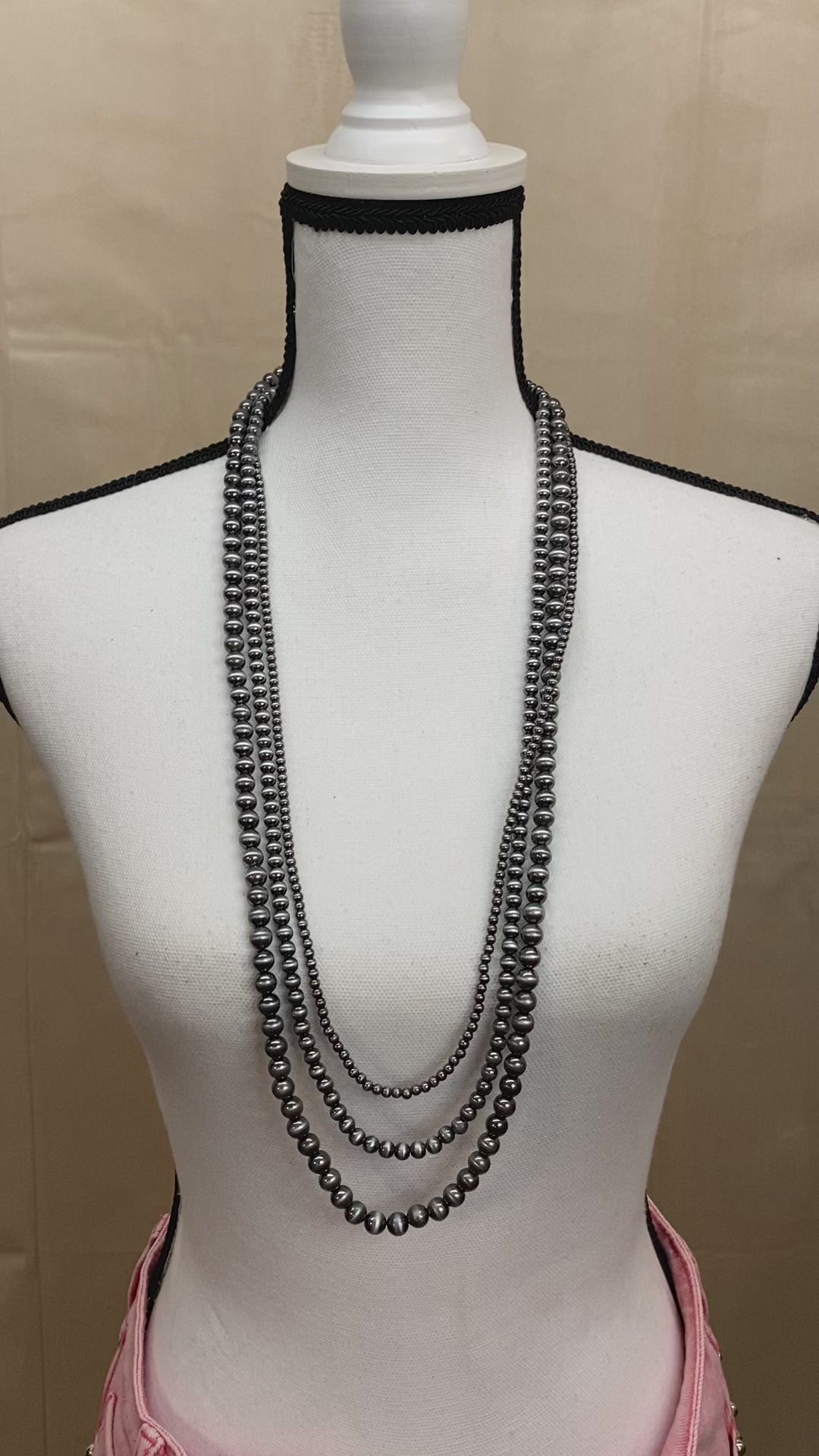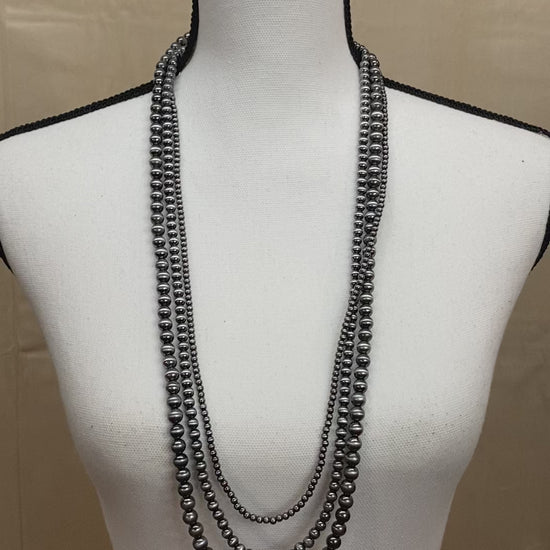 A 3 layered Navajo pearl necklace is a stunning piece of jewelry that features three strands of pearls in graduated lengths. The pearls are typically made of sterling silver and have a beautiful antiqued finish that gives them a timeless and elegant look. This style of necklace is often worn to add a touch of sophistication to any outfit, and the layers create a dramatic effect that is sure to turn heads. Whether you're dressing up for a special occasion or adding some sparkle to your everyday look, a 3 layered Navajo pearl necklace is a beautiful choice that you'll treasure for years to come.