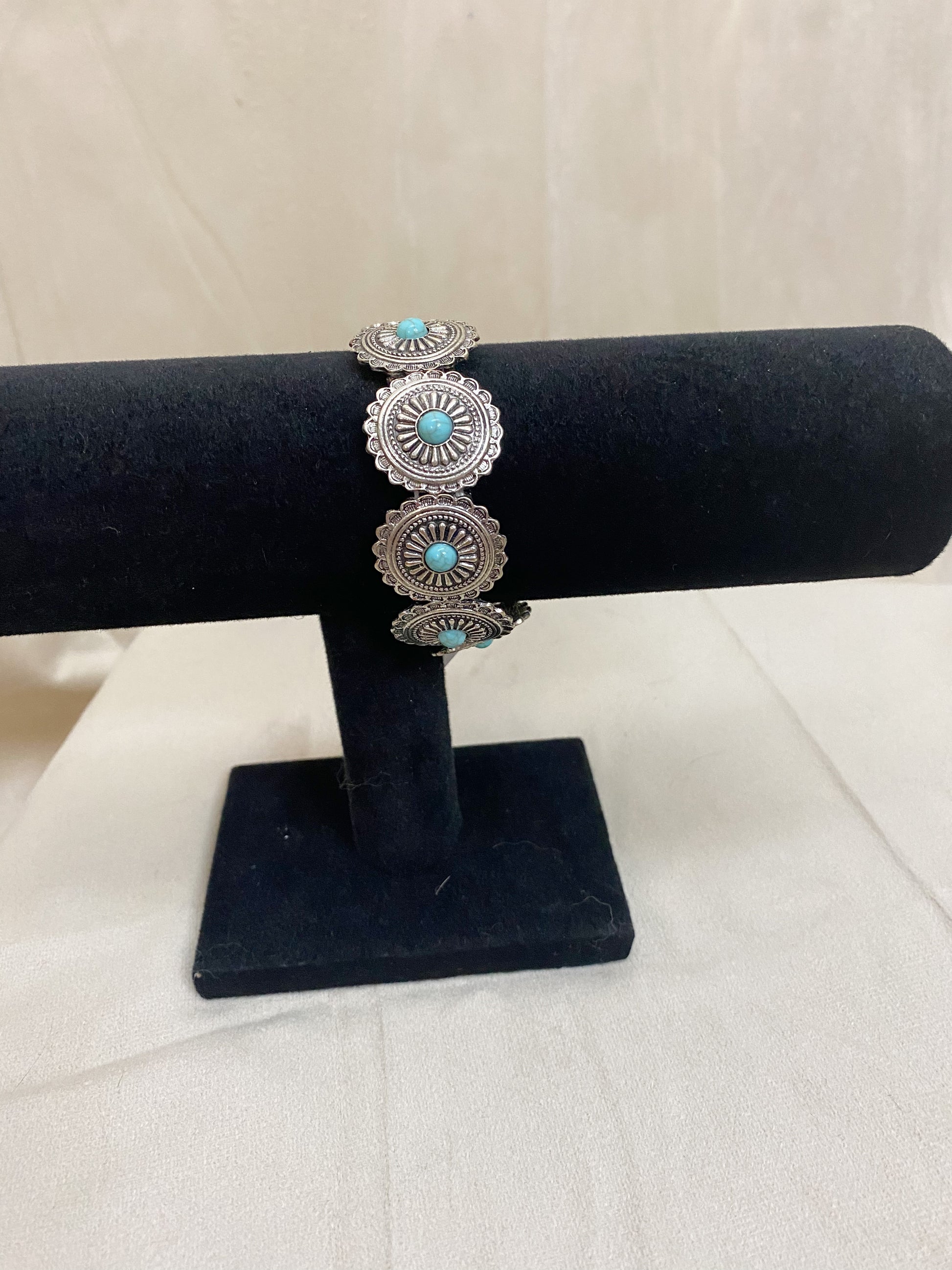 This silver Concho bracelet features beautiful turquoise stones and is designed with an elastic band for a comfortable fit. The Concho style gives it a timeless, western feel that pairs well with any outfit. The turquoise stones add a pop of color and natural beauty to the piece, making it a unique and eye-catching accessory. Whether you're dressing up for a special occasion or adding a touch of style to your everyday look, this bracelet is a versatile and stylish choice.